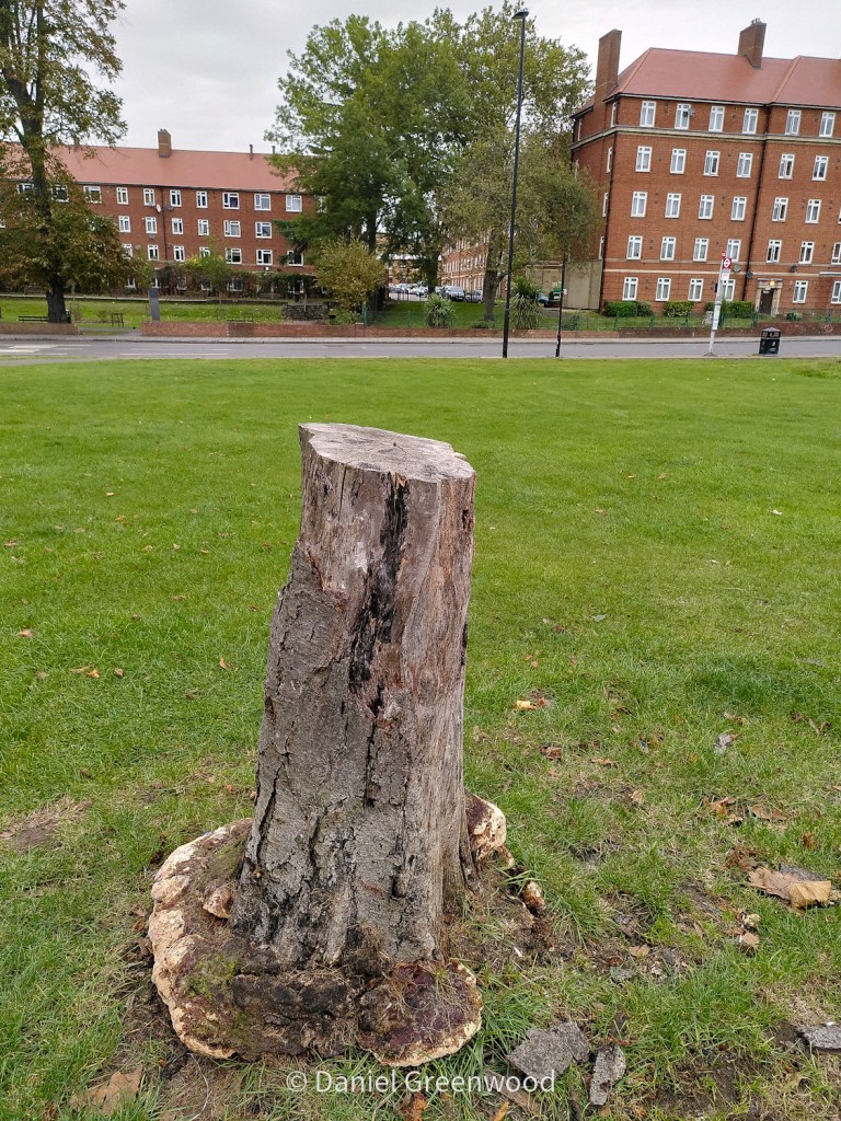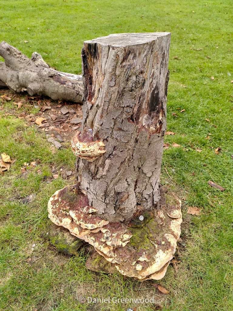 The trunk has been left for fungi, which is great. There were even the remnants of some oyster mushrooms growing from the trunk.