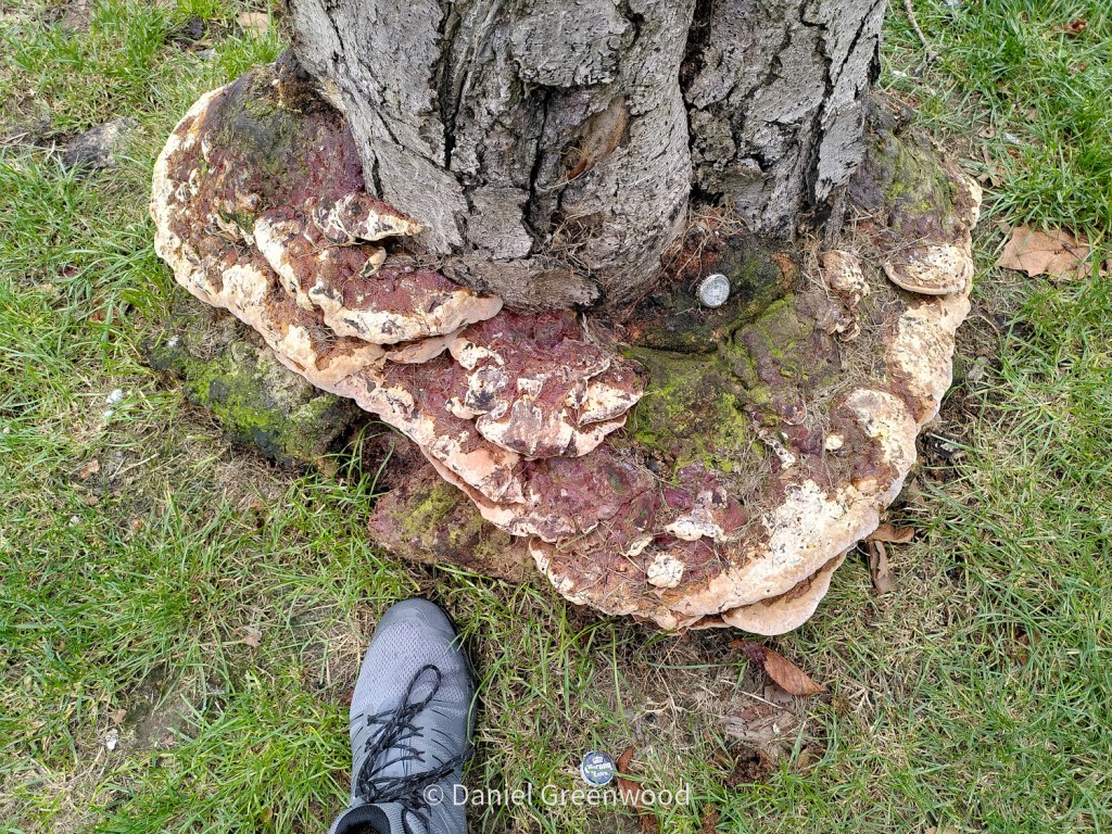 This is an impressive Ganoderma bracket, almost covering the entire circumference of this felled horse chestnut. I was here for maybe two minutes but I think it’s probably Ganoderma resinaceum.