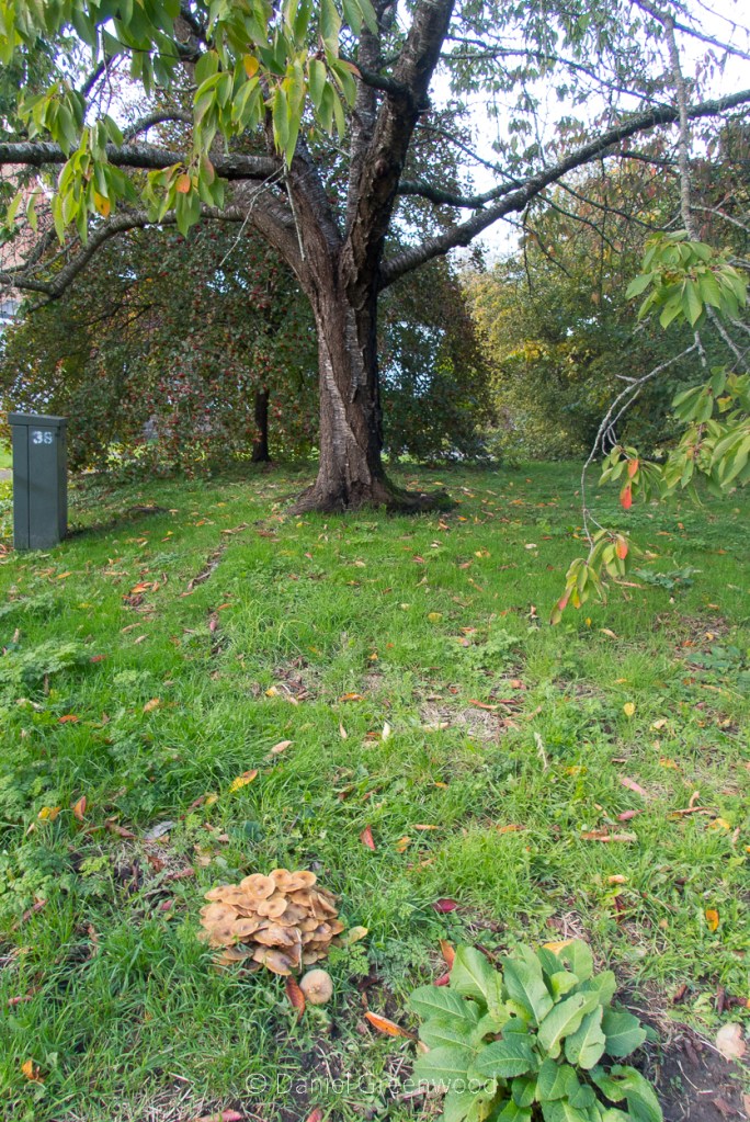 It was growing on what I would guess is the roots of the cherry seen here. I have a lockdown memory of a fast food delivery driver picking cherries and eating them from this tree.