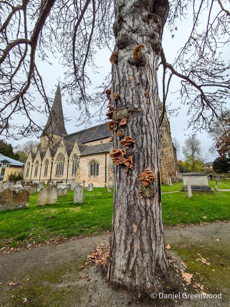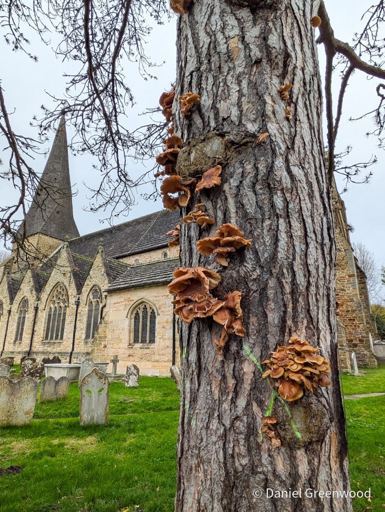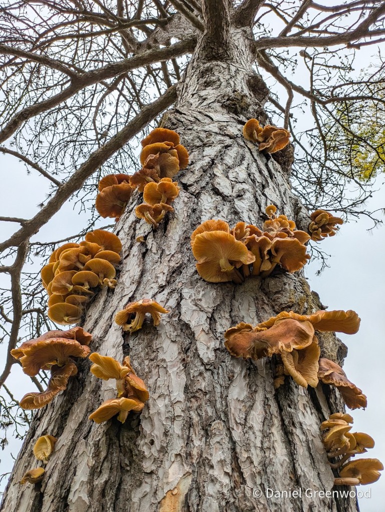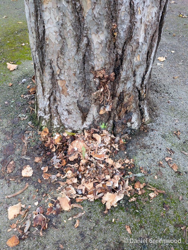 I was quite sure it was honey fungus but given time I’m not actually sure about that. It does look as if it is fruiting from the web of hyphae (boot laces) that honey fungus develops under bark.