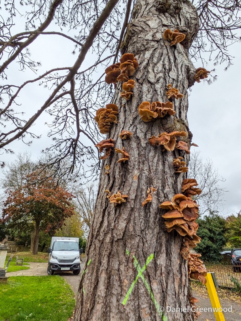 One afternoon I was passing the area when I saw tree surgeons surveying the tree. From a distance you could see the explosion of mushrooms all the way up and down the tree.