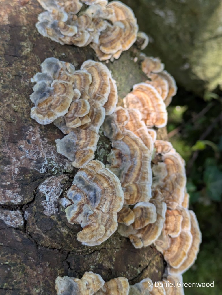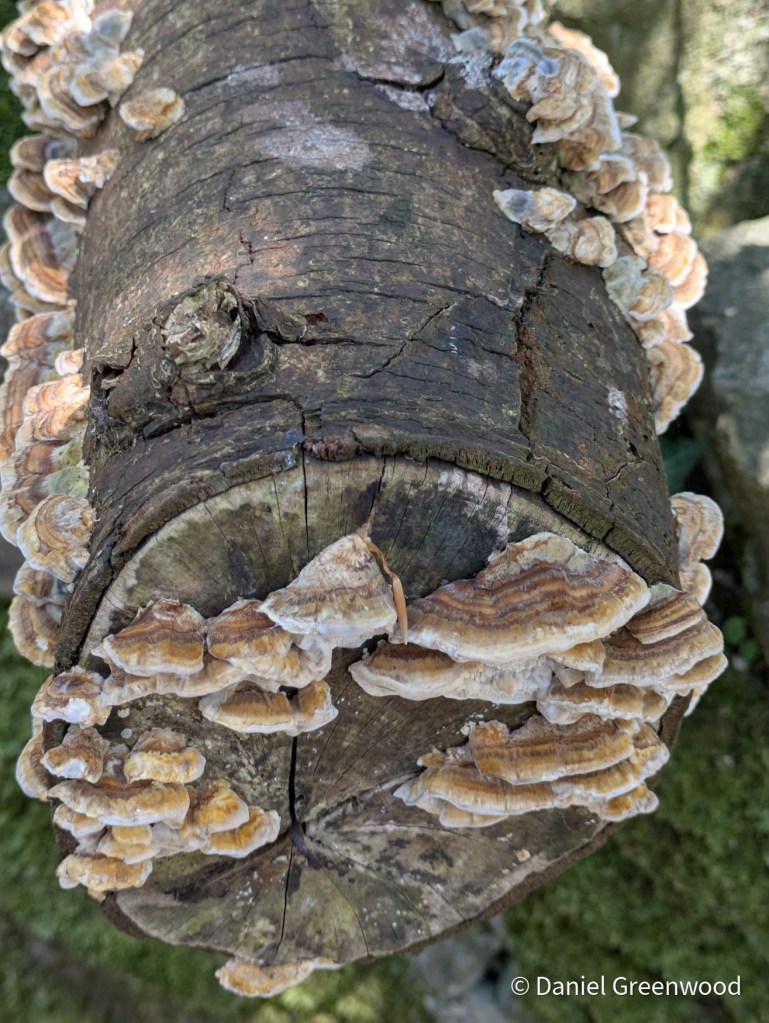 I spent a week in Devon in late April and there were no mushrooms at all. The only fungi available came in the form of lichens and these turkey tails (Trametes versicolor) growing in the shade.