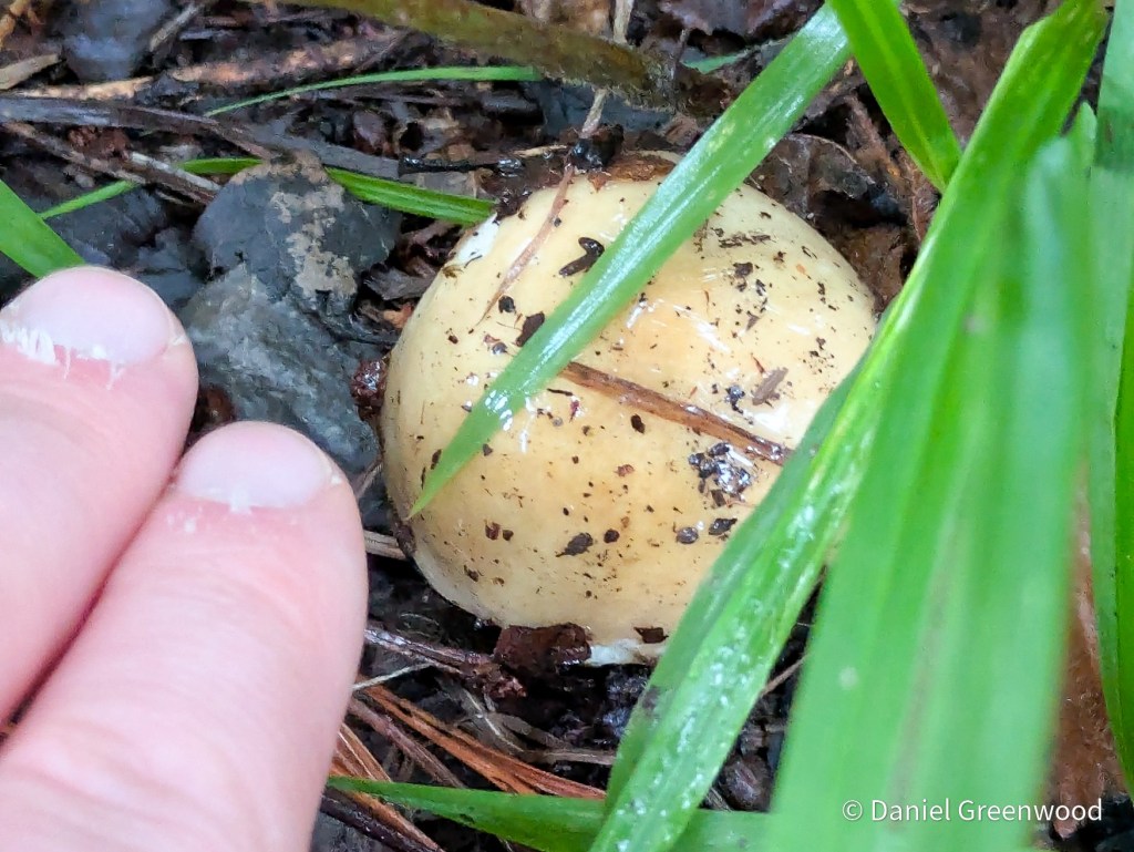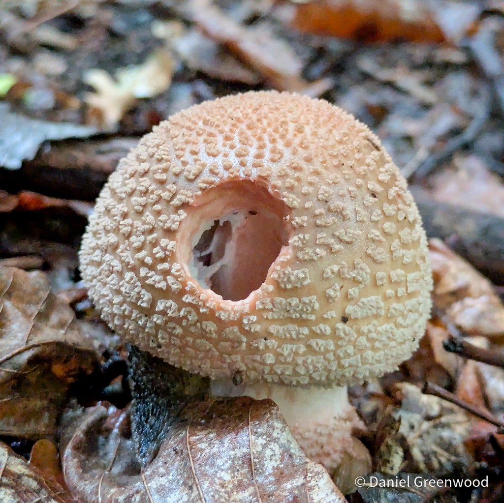 I only noticed the slug on this blusher mushroom when I edited the photo. The slug has eaten a hole in it!