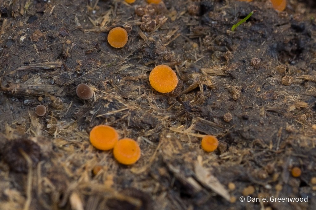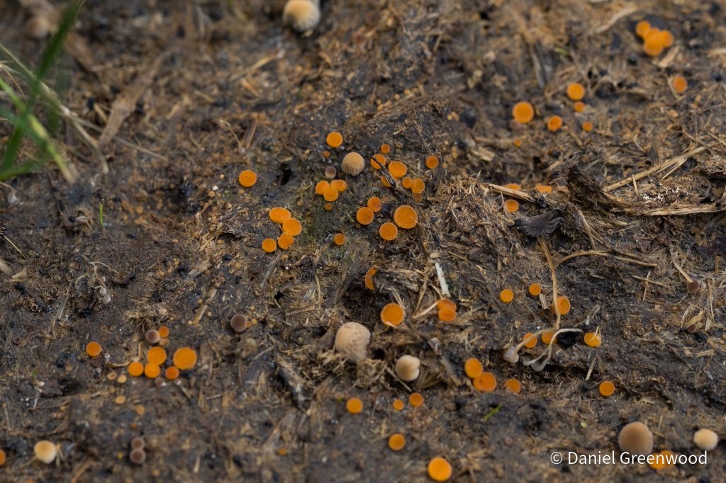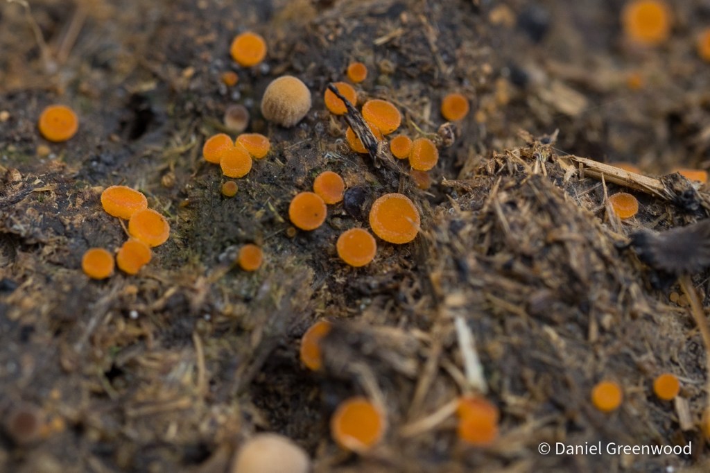 I spotted these little orange discs on a cow pat. They’re likely in the group Cheilymenia. The little mushrooms are probably fairy inkcaps.