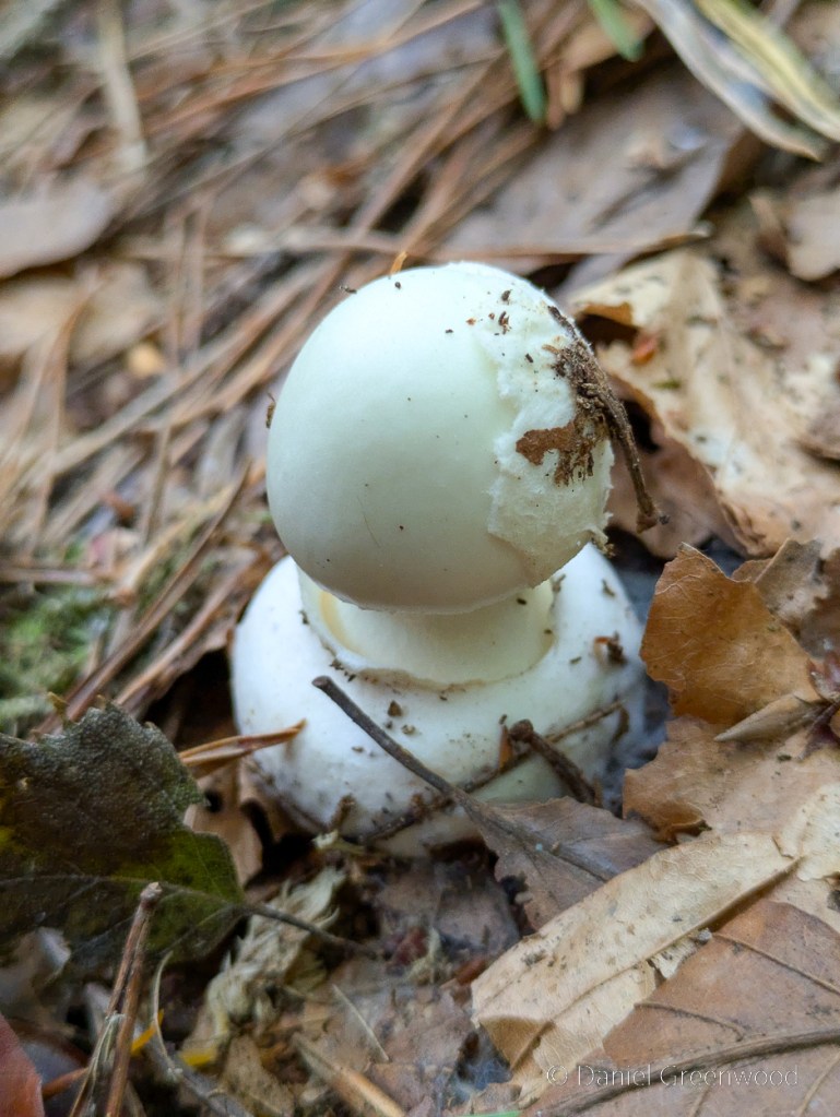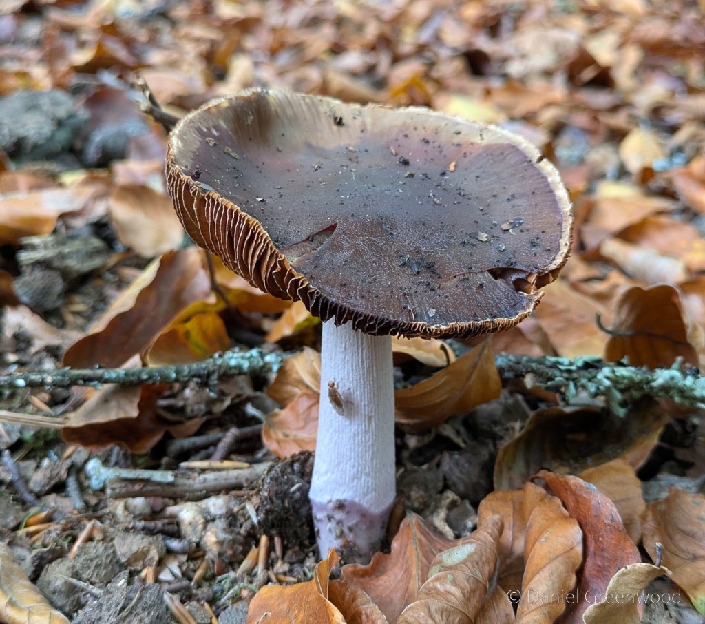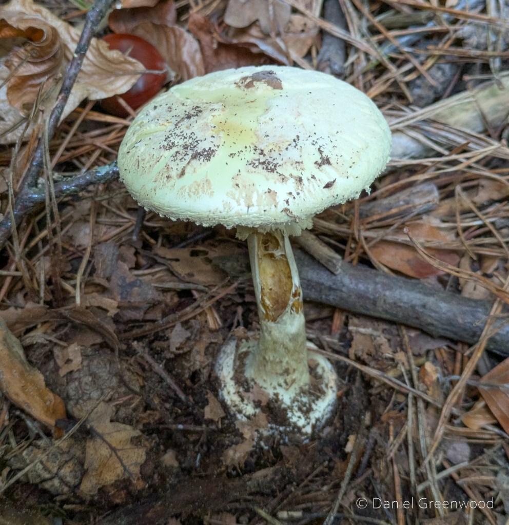 I was expecting to see some deathcaps during this walk, but we only encountered the false deathcap, which is not known to be deadly. My tip for identification would be the remnants of the universal veil which are seen here on one side of the egg-like cap as it emerged from the, well, egg-like volva in the ground. Without that, you could easily think the younger mushroom is potentially a deathcap.