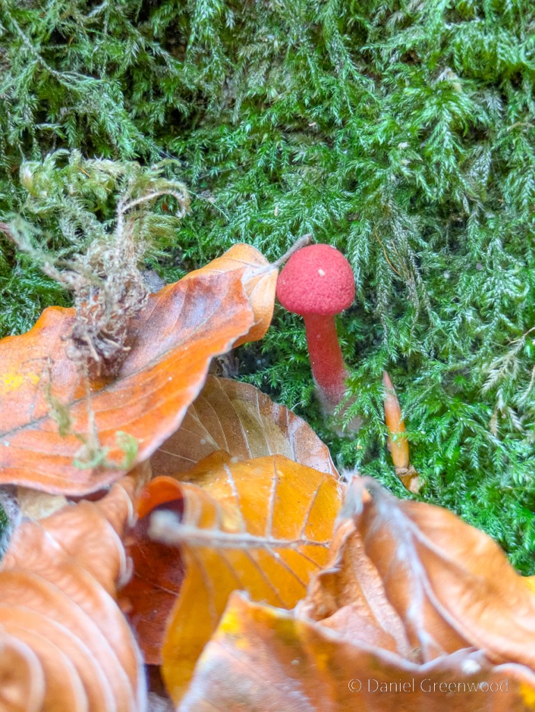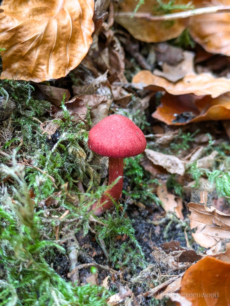 An attendee on the walk noticed this tiny red mushroom growing at the side of an old stump in moss. This appears to be blood red webcap (iNat), another new species for me if correct.