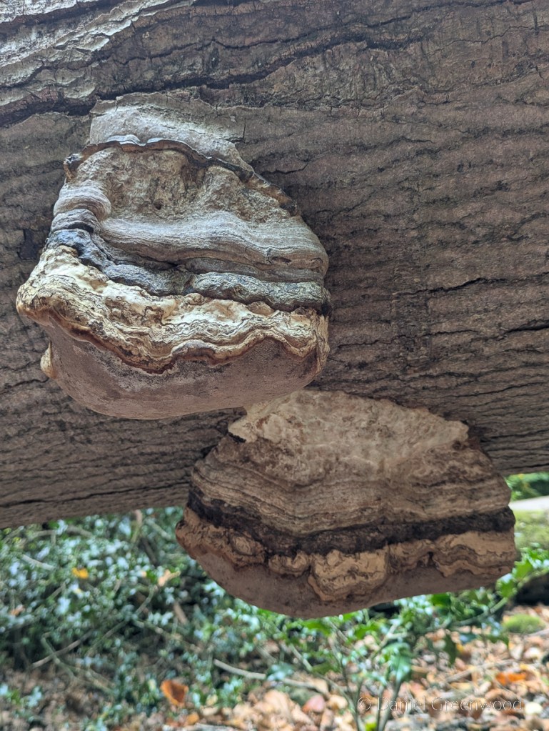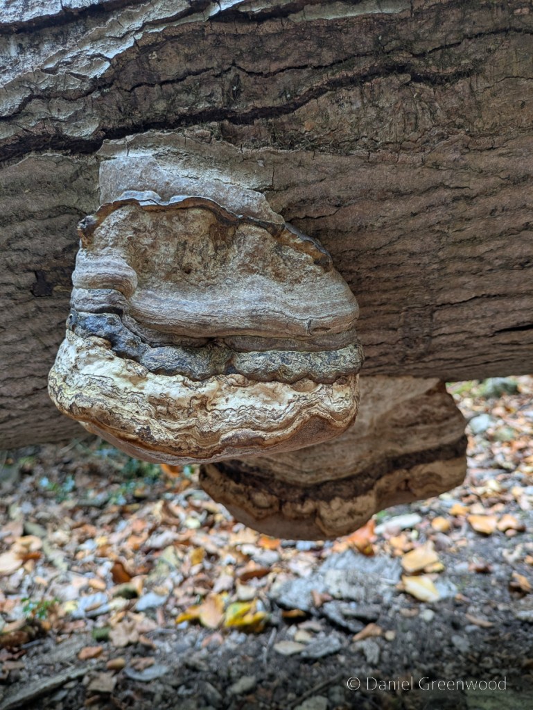 Nearby another attendee found this collection of hoof fungus. This isn’t a species I encounter too often, (and, out of interest, very rarely in London) so it’s always interesting to see. These two were rock solid, as ever, growing on the underside of a fallen beech. You can see they have grown after the tree fell, because they are not facing sideways.