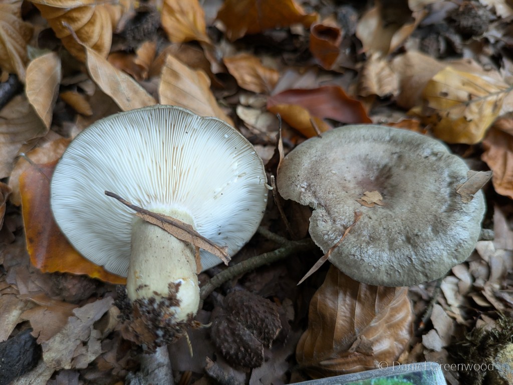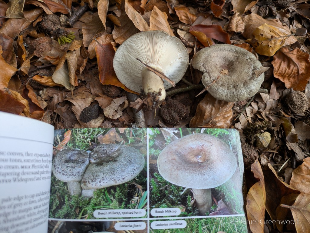 These milkcaps were very common. As you may appreciate from the image I’ve included from the field guide, I think these are beech milkcap. They were growing underneath beech trees and match the relevant diagnostics. The milk is white.